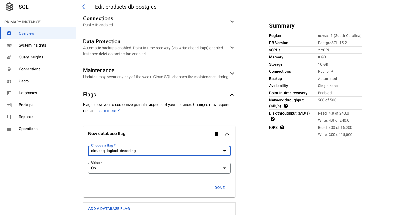 To enable logical replication on Cloud SQL for Postgres, set the cloudsql.logical_decoding flag to on. You can find the Flags section in the Edit Configuration view of your database: